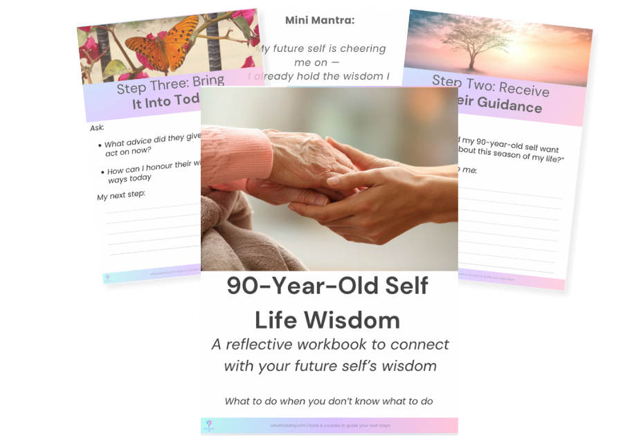The 90-Year-Old Self Life Wisdom Workbook is simple, soulful & practical. It’s designed to help you pause, listen, and move forward with more confidence & peace.