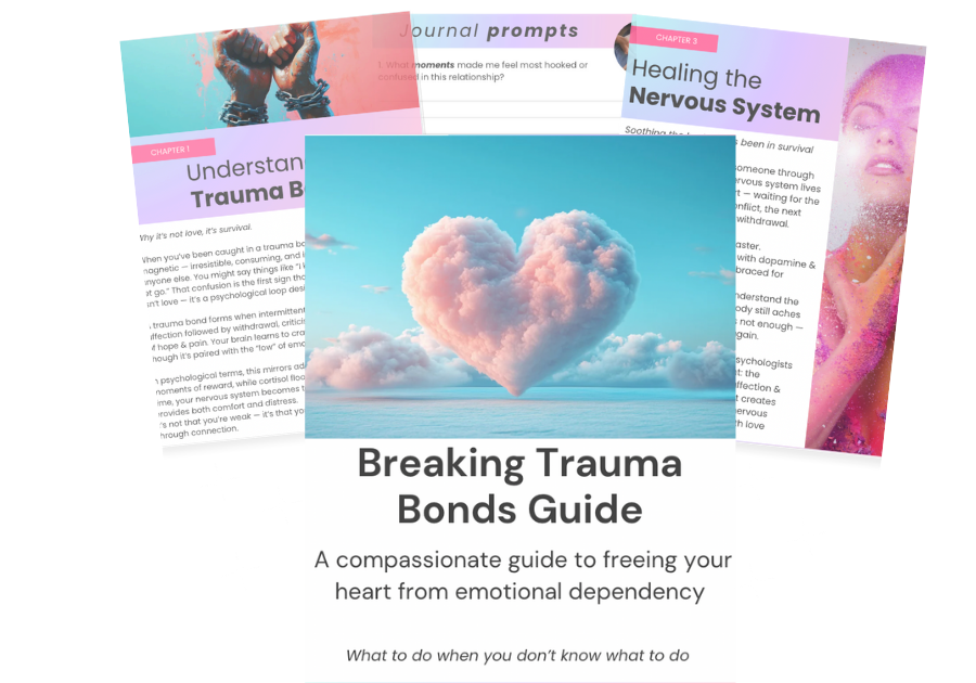 Breaking Trauma Bonds Guide helps you understand what’s really happening — emotionally, psychologically & physiologically — so you can release the bond with compassion, not shame.