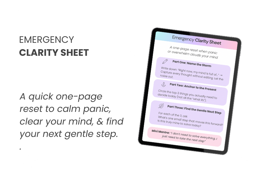 This printable Emergency Clarity Sheet is your quick reset when panic or overwhelm clouds your mind. With three simple steps—naming the storm, anchoring to the present, & finding the next gentle step—you’ll calm the chaos & regain focus. Keep it on your desk, in your journal, or on your phone for instant clarity anytime you need it.