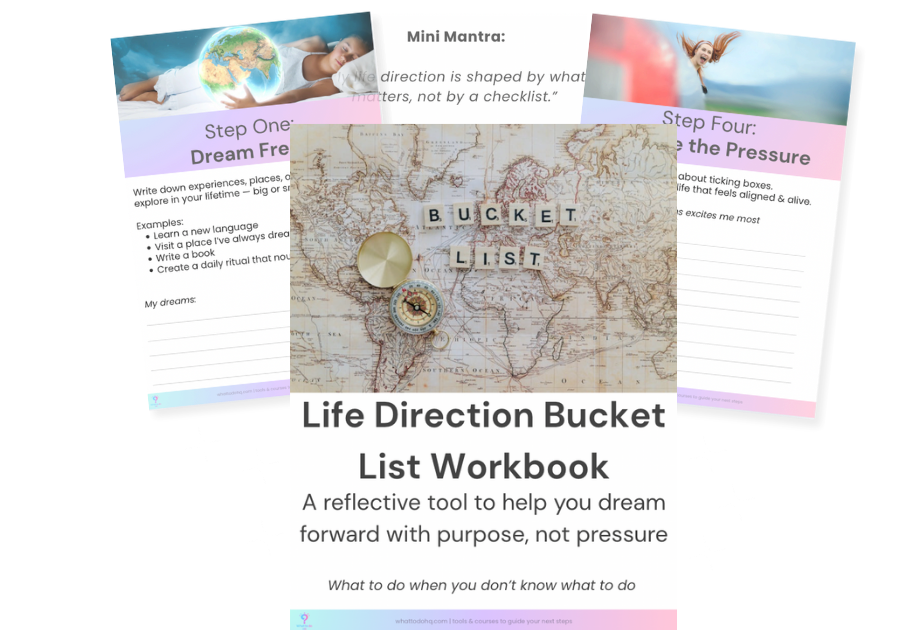 The Life Direction Bucket List Workbook is reflective, practical & compassionate — designed to give you clarity on what matters most & the courage to begin gently.
