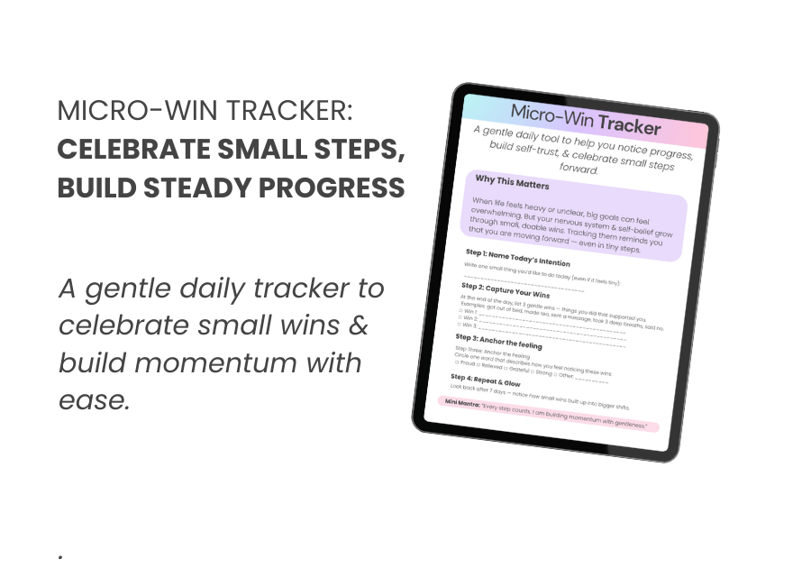 The Micro-Win Tracker Worksheet is a gentle daily tool to help you notice progress, build self-trust, & celebrate small steps forward. By setting a tiny intention, capturing three daily wins, & reflecting on how they make you feel, this tracker reminds you that every step counts — creating momentum & confidence, even in uncertain seasons