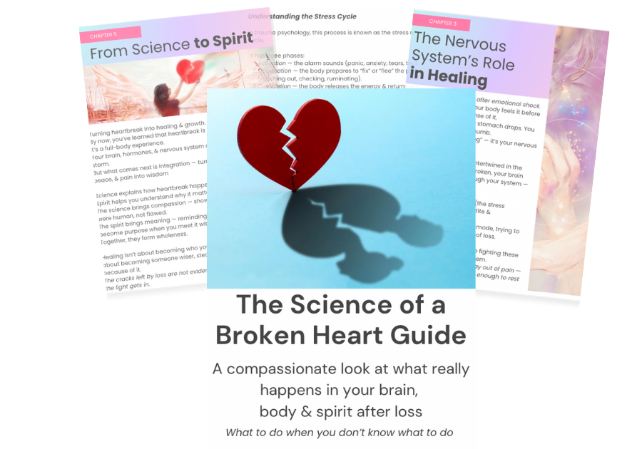 The Science of a Broken Heart Guide helps you understand the biology behind love, loss & recovery — so you can stop blaming yourself for what’s happening and start working with your body to heal.