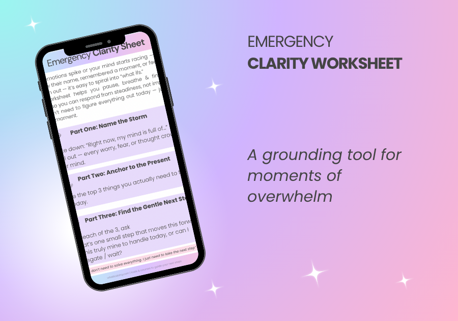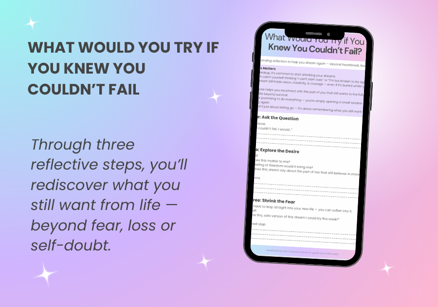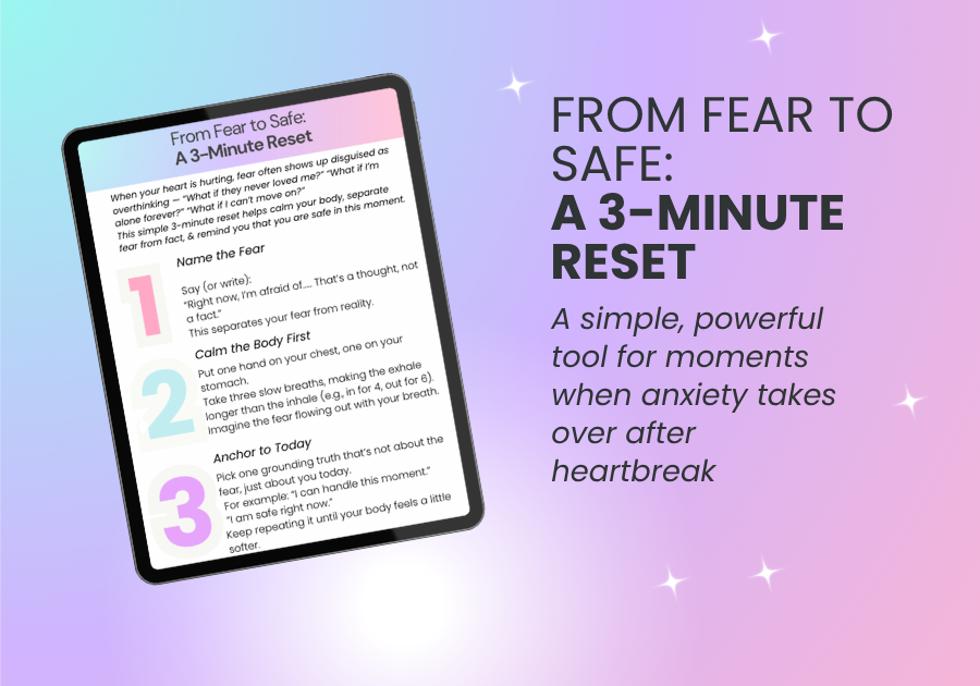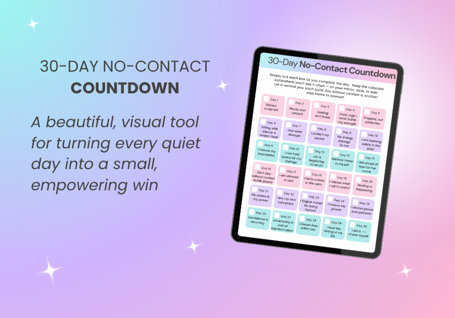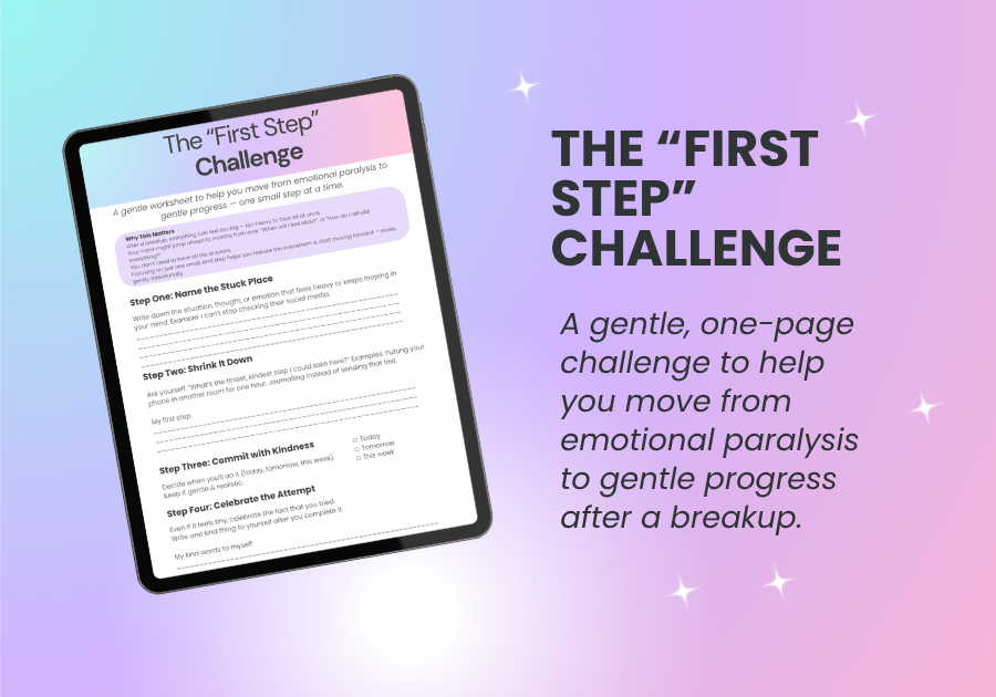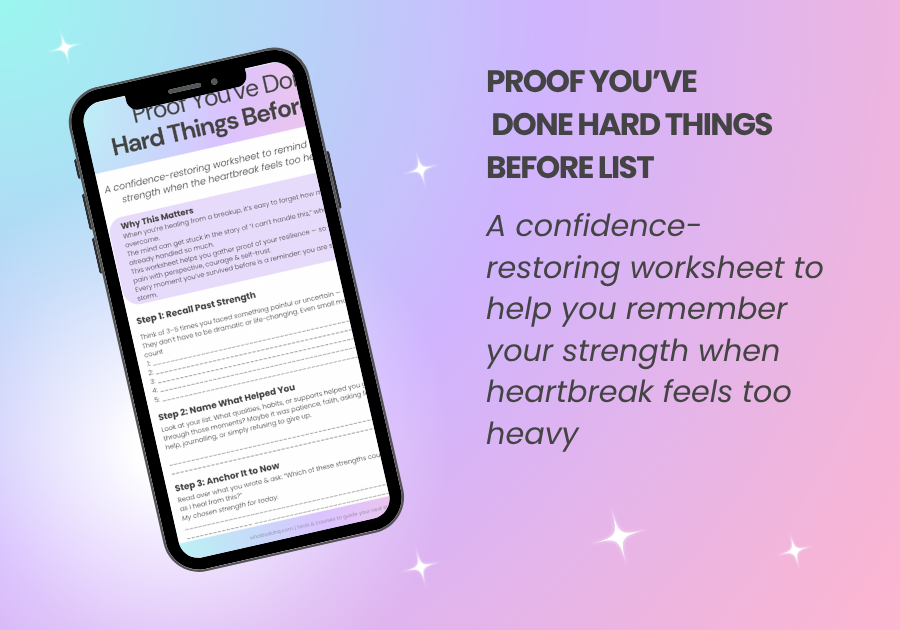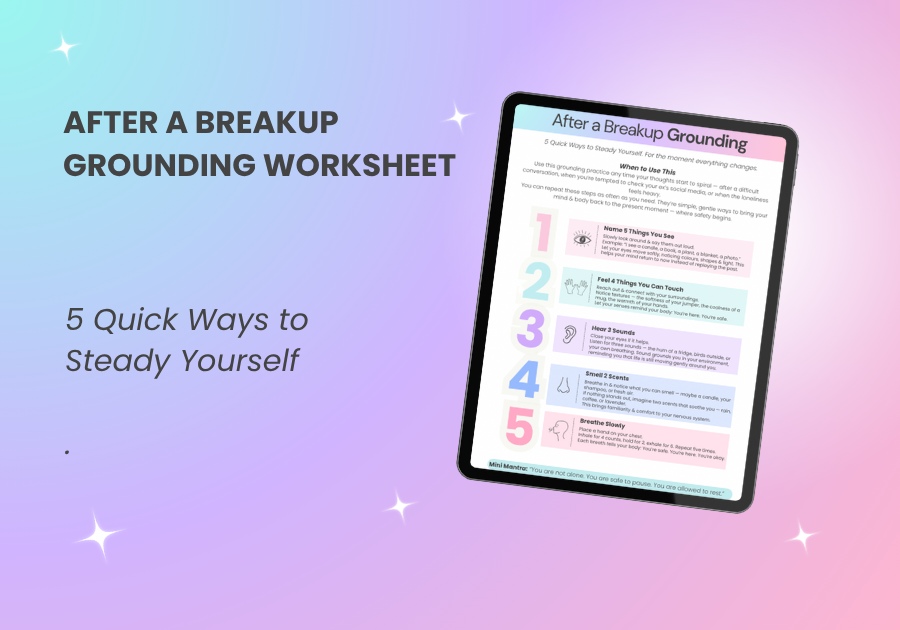 Quick, calming tools for emotional grounding & motivation — including After a Breakup Grounding Worksheet, The “First Step” Challenge, From Fear to Safe Reset, 30-Day No-Contact Countdown, and Proof You’ve Done Hard Things Before.